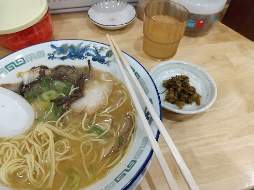 Read moreカウンターには食べ放題の辛子高菜や紅しょうが・懐かしいすりごま器に入ったゴマがあり、調味料関係は完璧・パーフェクトです・ 駅前西口から高宮通りの横断歩道に立つと、豚骨が匂いますが、博多の人は慣れているので良い💛匂いですが、醤油ラーメン好きには嫌な臭いです 私は、匂いに誘われてはいりました。綺麗な奥様がお水を運んで来て注文を聞きます。時間がかかるので作っていないようで作っています。 その間にもフードパンダみたいなデリバリーの注文の🎵音が鳴ります。 最近どこでもですが、客が少なくても提供まで時間がかかる店が増えましたね。 味ですが、潰れた世界で2番目に美味しい・逆さラーメンの味に近いです 中州川端の逆さラーメンが潰れたのかは知りませんが、あの味です。 高宮のこの場所には昔100円ラーメンがあり第一高校の学生が野間周辺からこの辺りまで縄張りだったので、今も学生割引があるけど、100円200円のラーメンではないので割引してもあまり効果はないでしょうね まあ、もしかしたら...