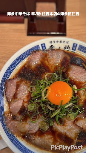 住吉に移転なのか新店なのか?本店としてオープンした幸ノ助。 近くには佐野ラーメンをオマージュしたすず喜や大人気のえびすやうどん、蕎麦の耕作など非豚骨系の麺屋がズラッと並んでいる。 さて入店するとオーダーは席でQRコードでオーダーするシステム。 最近増えてきたね。 まぁ慣れればいいんだろうけれど、どうも馴染めん。 あれこれ眺めるのも面倒なんで当初から目当ての中華そば&卵黄を選択して送信。 しばらくしてお待ちと配される。 ノーマルで丼一面をチャーシューが覆い、真ん中のネギの中心に黄身が乗っかる。 博多店の方と比べると盛り付けにも気を遣っている模様(笑) 澄んだ脂の下の真っ黒なスープの色合いは、博多醤油を謳っているラーメンの中でも個性的。 先ずはスープを一口やると、甘みの無いキリッとした熟成醤油の旨みがガツンと舌に伝わる。 豚骨鶏ガラ系であろう出汁もさることながら、この強目の醤油と脂感が何とも美味い! 合わさる麺は歯切れのいい中太ストレート。 小麦感豊かで黒いスープに染まっていて、しっかり馴染んだ感がありこれまた美味い。 チャーシューを喰み黄身を崩す。 慎重に麺に乗せてズズッとやれば、キリリとしたこれまでの味わいに円やかな旨みとコクが加わり絶妙な美味さ。 ここの醤油には個人的に黄身は必須! あるのと無いのとでは満足度が違う。 ズバッと啜り上げてご馳走さん。 そういや幸ちゃんラーメンもそろそろ啜りたいな。