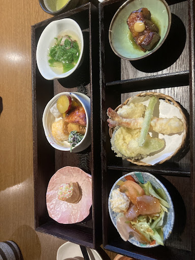 ランチで3.700円の会席を頂きました。 前菜、茶碗蒸し、お刺身、天ぷら、牛ステーキ、鯛めし、コーヒー。 全体的に甘めの味付けだったように思います。 お刺身は全部新鮮で美味しかったです。 ステーキはサラダ風で、たくさんの菜っ葉の上にお肉が2切れだけ乗っていました。 そのせいか、ステーキソースではなく、酸味の強いドレッシングがかかっていて、お肉が良いお肉だっただけにちょっと残念でした。 天ぷらは5品程あったでしょうか。 一口サイズで全て揚げたての熱々でした。 好みの問題かもしれませんが、天つゆが私には薄く感じました。 鯛めしは上品な味でした。 最後にデザートが付いているかと思っていたらコーヒーだけでした...
