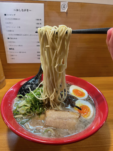 Read more今朝の新聞を見て、初めて来ました。高宮通りに面した駐車場の無い店舗で困りました!店構えが、とてもこじんまりした店で驚きました。入店した雰囲気は、生気がない?自販機で1番安い白豚骨なるものを買い、カウンターに着座。暫くすると水を持って来てくれた。カウンターのみ、8人掛けと3人掛け。大丈夫か、まだ券を取りに来ない!既に5分以上経過してるが、厨房は一人に対して客は7人。漂う匂いは嫌いな方の匂いだ。壁には訪れた芸能人の写真がベタベタ貼ってある。やっと来てくれた!麺の硬さは?やわ!本当に美味い麺は、やわでも美味いのだよ!博多人が皆、硬麺を好むわけではないよ。美味いから硬麺が博多で流行ったわけでは無いのですよ。昔から博多のラーメンは長浜地区に多数の屋台が有りました。酔い客や旅行者向けの店では有りません。九州随一の福岡魚市場があり、ここで働く数千人の腹を満たしていました。中でもここで働く重労働の沖仲仕の人々は、水揚げする船が入港する時期は1分1秒を争うほど忙しかったので、屋台に座っても悠長に麺の茹であがりを待てません。コップ酒を一気に2,3杯飲む間に提供して欲しい事から、生でも良いから早く出してくれ。店主、不味いよ、腹壊すよ!客、いいからはよだせ!から事が始まり、麺も早茹でように、段々細くなっていった。その内、一般の客がこの模様を眺め、格好つけて俺も硬麺!なんてぇ客が増えて行ったと言う歴史が有るんです。製麺屋も生食で食べることは勧めていませんし、美味しい麺の食べ方とは言っていません。オーナー達も、麺には最も適した茹で時間が有ると言ってます。そんなに好きなら、うどんも、パスタも、素麺も、味噌ラーメンも蕎麦も硬麺で食えばいいのに。ラーメンにだけ、硬麺で!格好つけ以外の何物でもないと思います。来た〜!ラーメン到着。んっ!考!一口所望。やっぱり。臭いの段階で思ってはいたが、ヤッパリね。このスープの味と麺の触感は、久留米ラーメンですな。それも余りパッとしない久留米ラーメン。650円+駐車場200円!今日も残念です。勉強には金が掛かります。今日は1杯だけにしとこう。また...