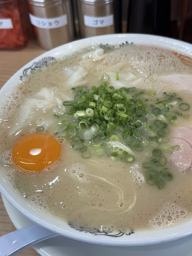 (English Translation) A tonkotsu ramen shop in Watanabe-dori. This time, I had the tonkotsu ramen topped with wontons and a raw egg, along with some onigiri (rice balls). The tonkotsu ramen was absolutely fantastic. The soup had none of the strong odor sometimes associated with tonkotsu, just pure, extracted umami. The wonton topping was smooth and went perfectly with the soup. The onigiri on the side were also very delicious; their gentle saltiness was a great match for the rich tonkotsu broth. The shop has about 10 counter seats and a casual atmosphere, making it easy to drop in. I think it's perfect for dining alone or with friends. This is personally my favorite tonkotsu ramen. I especially recommend this bowl to anyone who dislikes the strong smell of some tonkotsu. I definitely want to go back. It's quite filling, so next time I think I'll get it with a side of plain rice instead of onigiri. It's a great spot that I can recommend to tourists visiting...