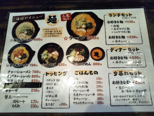 Read more私のコメントの共通で、味の好みは人それぞれですので星の数は良い悪いではありません あくまで私の舌の感覚です。 大橋駅付近には既にコメント済みの3件の美味しいラーメン屋があります。 まずお店の名前が読めなかったのでスタッフに質問すると「いるかやJです。 ラーメンは2種類あり今回私はいつも通りのとんこつラーメンを注文しました。 このお店のとんこつラーメンも美味しく頂いてきました 特徴としては ネギの刻み方に特徴があります 文章では表現が出来ないので 実際に行かれた時に 味わうのがいいと思います。 2019年 7月30日現在で 600円でとても美味しいラーメンを食べることができます。 刻み方に特徴があるネギの他に 一般的な博多ラーメンに多いゆで卵ではなく うずらの卵 そして 大きめの海苔 などが入っています。 また九州のラーメンに多い紅しょうがはこの店にはありません。 その代わりに食卓には おろしたニンニク と 辛子味噌の2種類がツボに入って置いてあります。 ごまも九州に多い白ごまではなく黒ごまが ごますり器に入れて置いてあります。 いつも書くことですが まずそのまま生で 食べてそして半分ぐらい食べ終わった段階でこのような調味料や あるいはこの店にはありませんがカラシタカナなどを 直接丼ぶりに入れるのではなく スープをレンゲですくってその中にほんのちょっと試して 入れてみて味の変化や自分の好みを確認した上で使用されるといいと思います。 おろしにんにくはすぐにイメージができると思いますがもう一方の辛子味噌はお店によって 風味や味付けが全然違いますので これを意識したほうが より美味しく召し上がれると思います。 ちなみに私はこの店の辛子味噌だけは落第点をつけました その理由は 質が悪くて ちょっとでも入れるとせっかくのおいしいラーメンのスープの味が全く別物になりすぎる というわけです。 この辛子味噌の出来の悪さ以外には スープも麺も本当に美味しく召し上がれるお店ですので まず最初にそのお店の 味である何も入れない...
