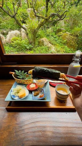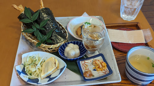 福岡から糸島に向かう途中にある古民家風カフェ。長垂山の南のふもとにあって、車がないとちょっと難しい場所にあります。駐車場は数台停めれます。 ・ お店は古民家風の木造でカウンター席・テーブル席・畳席があるのですが、カウンター席からは中庭を眺めながら楽しむことができます。 ・ 今回はお店で1番人気の海老天むすとおそうざいがセットになったランチを注文。 ・ 海老天は揚げたてで海苔はパリッとしていて食感も楽しめます。丸ごとの海老天を巻いた大きめのタイプなので、両手でもってかぶりついちゃいました(笑)食べ応えも最高でした! ・ 他のお料理も地元素材を使った優しい和食。窓から自然を眺めながらの和食なごみます。休みの日はこーゆーお店でゆっくりいかがですか? ・ ここはご飯だけでなく季節のスイーツやプリン、今の時期はかき氷もオススメです。(プリン...