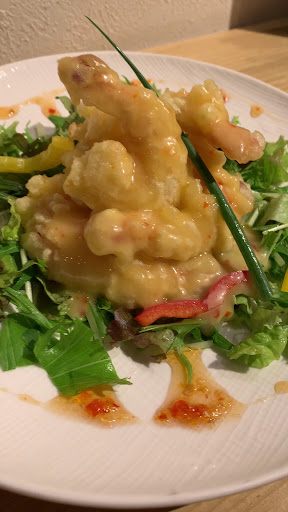 2020年12月 仕事帰りに1人で伺いました。私の本日のミッションは、定番メニューのお味と夜の雰囲気を知ることです。 ランチで一度お伺いしていました。その時の印象は料理は女性向け、店内はカフェっぽい様なイメージでした。 結果的には雰囲気は窓が無いので、昼も夜も変わりませんでした。今では数少ないタバコが吸えるの店なので愛煙家の方は嬉しいのでは無いでしょうか。 本日頂いたのは ・エビマヨ ・唐揚げ エビマヨのエビは5尾、野菜が多くて彩り豊かで盛り付けがキレイでした。皿の縁に沿ってのスイートチリが彩りのアクセントになっています。衣付けて揚げられたぷりぷりのエビ🦐に特製のマヨソースが良く合っています。 唐揚げは竜田揚げ風の感じで線キャベツが添えられています。ジューシーなもも肉で美味しく頂きました。 女性の店員さんが、常連さんと思われる方の席にいて、ぼぼワンオペでしたが、サービスに不満はありませんでした。