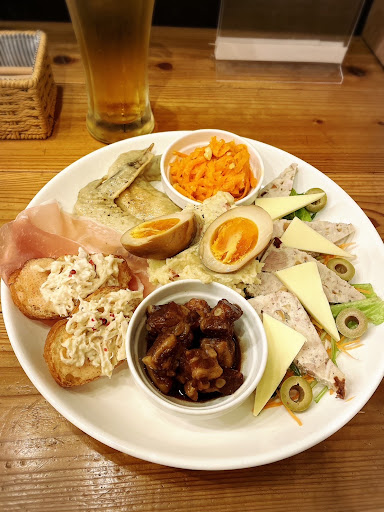 シックラープレート 10種類くらいの前菜の盛り合わせ。 どれも美味しかったが、ポテサラが特に絶品だった。あと鶏とナッツのテリーヌや豚軟骨の醤油漬けも印象的だった。 個人的にはワインやスパークリングと合わせるのがいいと思った。
