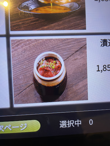 私はランチの漬け込みカルビランチを頼みました。 タッチパネルの肉は赤赤してましたけど、実際に来てみるとどす黒い肉が来ました。 しかも黒い部分と赤い部分があり、より一層黒さが強調されてました。 しかもどす黒い肉だから焼き加減が分からず焼けてるのか生焼けなのか分からず。