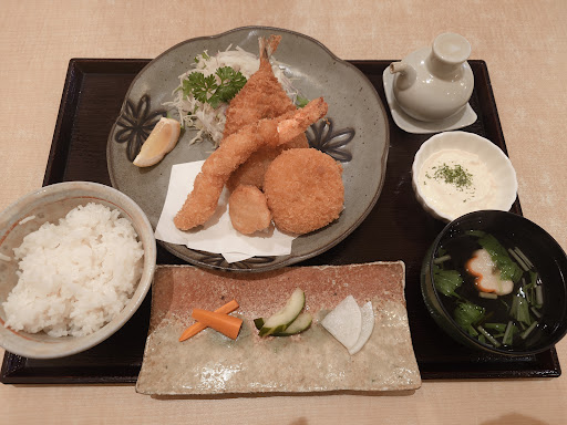 メインのミックスフライもエビフライ、カニクリームコロッケ、あじフライの3品でボリューム満点です。
