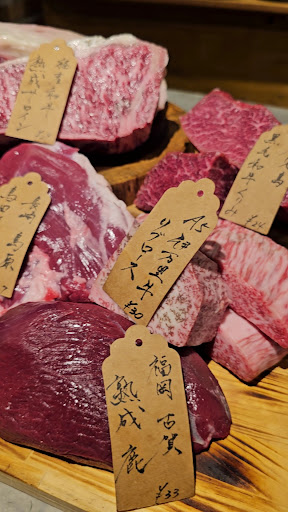 お肉は100gから注文できます。黒タン、子羊、鹿肉、サーロイン、リブロース、くりみなどのお肉が用意されており、実物を見ながら説明を聞いて注文できます。