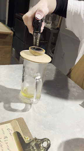 最後にぼくは甘いものは食べないのですが、スモークウィスキーバニラアイスがあったので注文。ワイングラスの中でスモークされたバニラアイスにウィスキーの香りをスプレーしてくれます。甘いものが苦手な僕でも美味しくいただけました。