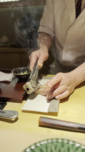 We booked the 6:30 PM seating for two, and finding the restaurant was effortless—it's conveniently located on the ground level of the building. The space itself is small and intimate, accommodating up to nine guests, which makes for a cozy and highly personalized dining experience. The chef meticulously prepares everything right in front of you in a classic omakase setting, assisted by two attentive staff members.