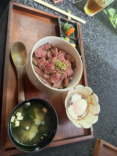 Small and cute restaurant that offers a view of the pagoda at Tochoji Temple nearby. The staff is friendly and very kind. For Wagyu beef, the pricing is good and the serving is large (around 3-4 layers of meat on top of the rice)! The set comes with egg, soup, and some picked veggies in addition to the actual steak rice bowl. Everything was delicious & prepared with attention to detail! When it was served, the waitress took the time to explain the best way to eat it as well! I came around 12:30 for the lunch special, and there was no wait 😊 A little hidden, but perfect for a lunch or dinner spot if you are touring the temples around Fukuoka Gion! It is right between two of the largest (Tochoji...