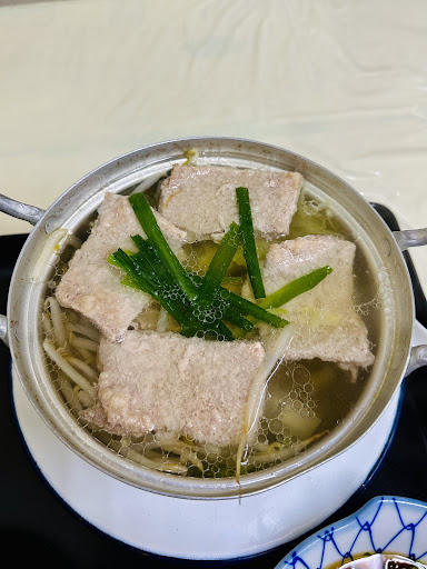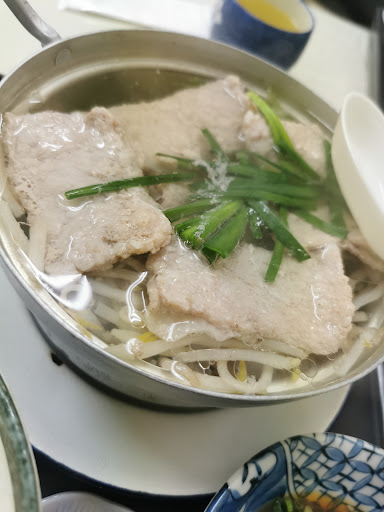 Read more知る人ぞ知る店。 予備知識なしではまずたどり着けないでしょうね。 休みも不定期多し。 店内はBGMなしで、殺風景だが、10時45分の開店からお客が絶えない。 豚チリ、ご飯大盛り800円。 澄みきった熱々の鯛出汁?系のスープに、もやし、玉ねぎ、キャベツなどの野菜と、豚のミルフィーユが5枚ほどのった、シンプルで胃に優しい鍋と、どんぶり飯。 特にこれと言って味付けしていないので、水炊きのようにぽん酢で食べる。 美味い。完食。腹パンです。 飲んだ翌日の寒い日に最高の鍋って感じです。 警察関係の方がとても多いので、やましい事のある方は行かないほうが吉です(笑)