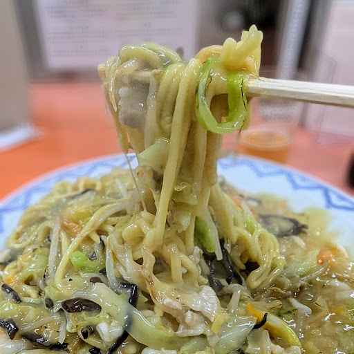 かなり熱々!湯気がもうもうと立っている。太麺の、インパクトがすごいのと具材がゴロゴロと餡にまみれているのが嬉しい。
