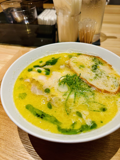 ニシムラ麺の新形態。 ミシュランシェフが提供する、ちと趣の違うラーメンが楽しめる店が近くに出来たとなると啜らずにはおれんわな。 場所は大名ガーデンシティ。 館内に入ると造りから何やらブルジョワな雰囲気。 まぁ日頃からラグジュアリーな生活を送っているnonopapaとしては何ら臆することなく店を目指す …ってスゲェ行列やんか! 平日の昼過ぎなら大丈夫かと思っていたが甘かった。 まぁしゃあない、今日はここと決めた以上待ちましょう。 3〜40分待って席に通される。 比較的箱が大きいので思ったよりも早かったな。 初回はクリーミーとんこつを選択。 お店の人に炊き立てご飯を勧められたがノーサンキュー。 これが後に後悔することになる。 お店は広めの白木を基調としたL字カウンター&テーブル席。 和モダンな雰囲気で奥の壁にはワインがズラリ。 夜は様々な料理が楽しめるそうな。 しばらく待って盆に乗って配される。 写真が上手く撮れてなく、いっちょん美味そうに見えないが、およそラーメンに似つかわしくない美しさ。 先ずはスープを一口。 確かに豚骨を感じるスープなんだけれど、それプラス何や様々な旨味と香りを感じるな。 塩味は控えめなんだけれど、チーズが乗っかっていたりして舌に伝わる味はなかなかパンチがある。 特に香り豊かな青のりオイルが新鮮なアプローチ。 確かにラーメンのスープじゃあるんだけれどフレンチのスープをラーメン的にアレンジしたような未経験の味わいに思わず唸る。 合わさる麺はご存じ慶史謹製の中太麺。 風味良くムッチリした歯触りでスープの絡みも上々。 咀嚼する度に風味が増し、鼻に抜ける香りも宜しく美味いねぇ...
