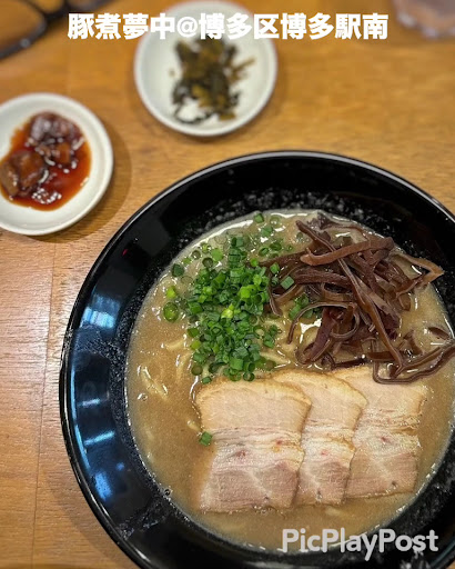 前回濃厚豚骨らーめんがすこぶる好印象だった豚煮夢中。 今回はノーマルの豚骨らーめんをオーダー。 お店の人は「白」と厨房に伝えていた。 給水器横のニンニク醤油を小皿に取って出来上がりを待つ。 やがてお待ちと配されたソレは見た目はそれ程特徴的なものはないけれど、一口啜ると濃厚な旨みがブワッと口中に広がる。 元ダレかな?知っている博多ラーメンの風味とは一味違うね。 卓上に定番の胡椒がなく七味を置いているのも、この味だからか? 何にしろ美味い! 合わさる麺は小麦感豊かな細ストレート。 券売機には中細と書いてあるが自分の感覚的には細麺と言ったほうがしっくりくる。 ノーコールでカタめに揚げられていて適度な粉っぽさがトロッとしたスープを引き揚げコレまた美味い (^^) いやはや個性が光る一杯やね。 ズバッと啜り上げてご馳走さん。 次回から黒と白悩みそうなくらい、どちらも美味かった。
