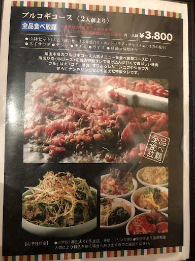 We ordered Bulgogi from the menu (photo). It was 3,800 yen per person, minimum order of two. As shown in the picture, we received mostly vegetables and very sparse meat. The meat was equivalent from beef from Yoshinoya, short plate but higher in fat than normal, see photo. Some of the kimchi was too old for safe consumption. I would have paid 680 yen per person, but not 3,800 per person. I paid 16950, and it was...