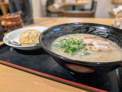 メニューはシンプルです。 ラーメン、ちゃんぽん、チャーハン、餃子といったところでしょうか。今回はラーメン半チャーハンセット(細麺、ネギとっぴんぐ)を頂きました。妻はちゃんぽんを頼んでいました。 ラーメンは細麺でバリカタを頼みました。麺がバリ細くてSinSinを彷彿させます。スープはシンプルな長浜ラーメンという感じですね。おいしいです。いやー、この細麺がここで食べれるならSinSinにワザワザいかなくてもいいな。