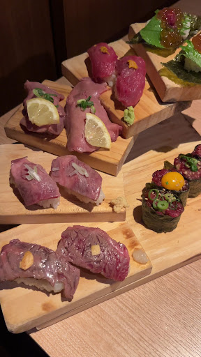 まずは目を引いた「肉寿司五段盛り」。一皿に豪快に盛り付けられた肉寿司は、牛や馬など部位の違いを楽しめ、口に入れるとしっとりとした旨みが広がります。。