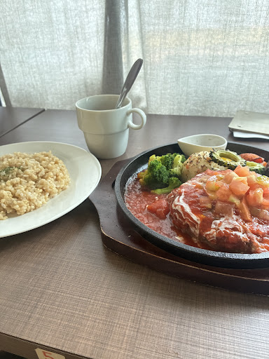 ハンバーグは玉ねぎ多めなのかやわらかめ、ソースが4種、私はトマトにしましたがさっぱり甘酸っぱくて食べやすいです。お子様にもおすすめです。 ハンバーグプレートでこんなにお野菜乗ってることもないので彩りも良くて嬉しかったです。