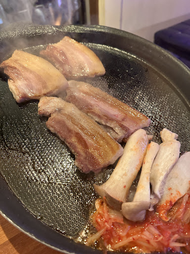 問題は楽しみにしていたサムギョプサルでした。サムギョプサルが食べたくてあぷろに行ったのでもちろん頼みました。サムギョプサルは一人あたり税込1518円しますが、肉は1枚だけでした。野菜やキムチも焼くんですが、出来上がった状態では鉄板の上がスカスカでした。1500円払って豚肉が1枚というのが私には満足できませんでした。