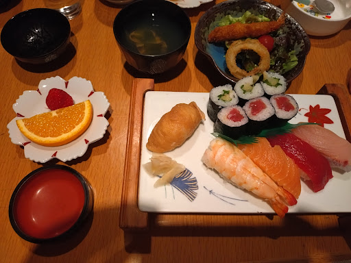 What a great lunch deal! 800 yen for 4 pieces of nigiri sushi, 6 pieces of maki (3 maguro, 3 takuan), one Inari, clam soup, a salad with a fried shrimp and an onion ring, and a little fruit plate for dessert (three huge grapes and some persimmon. The place was quiet so I wasn’t sure at first, but everything...