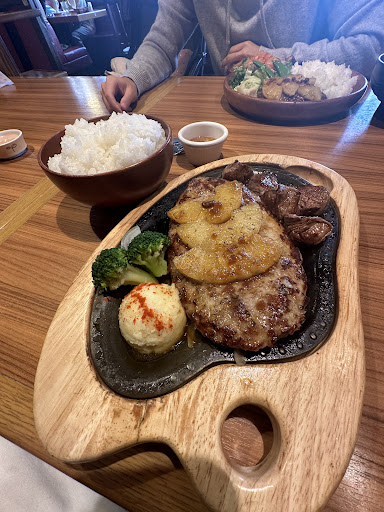 I got the hamburger with steak and pineapple on top. First off I love the vibe in here. Just a cool fuinki and kinda makes you feel like you’re back in America a little bit. Incredible service and REALLY good value for your food. I’ve had really nice / expensive hamburgers in Japan and while Definately high quality, the portions are always lacking. This place gives such huge portions that filled me up and the quality of meat was awesome. The steak was really good too. My only complaint is that the cast iron pan kinda seeps into the flavor of the food. I don’t know if this is a cast iron problem or the specific cast iron they used. But the plate has a very strong iron smell and the last bite of my potato salad tasted of strong cast iron. Was unpleasant but everything else...