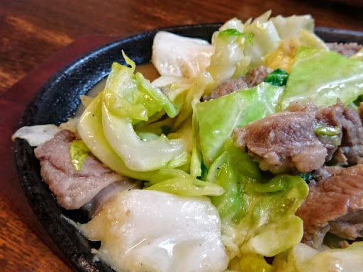 キャベツの量が多めなんですね‼️ というのも、厨房内にビニール袋70Lくらいに しこたまキャベツの仕込まれたものが3袋くらいあり、黒い大きな鉄鍋で肉とキャベツを炒めてくれています。