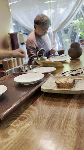 Read moreBeautiful building, cute coffee roaster on the main floor, charming cafe on the 2nd floor. So Lovely. But be aware, there is some serious coffee making happening here. With a selection of beans from across the planet, at all different price points, coffee is all they make here. (fruitcake is supplied by a bakery) And only one person makes it. She is a master with the flannel filter, and with the bean selection. It is a marvel to watch. We got there half an hour before opening and it was already lined up. Lucky for us that all the other customers chose the tables, as we got to sit at the bar and watch the artistry. She chooses the beans by hand, literally, tossing the less-than-perfect ones aside. Then a precise grind, followed by the pourover. She is so focused - the other staff dare-not say anything during the pour - the 25-30 grams of coffee result in a surprisingly small serving of intense coffee served in a pre-heated and elegant cup with saucer. If you ask for cream, you receive a little creamer so small, you can't help but smile. It holds less than a eyedropper might hold. But it is enough. Don't ask for sugar..... Its a delicious lesson in what coffee can be, maybe even transformative. But it is not quick. This expression of coffee takes time. Be patient, soak up the ambiance while you wait. You will be rewarded! (If you arrive with the opening rush, and 'IF' you can, sit at the bar and order quickly. We were done and finished our coffee before the 2nd table was...