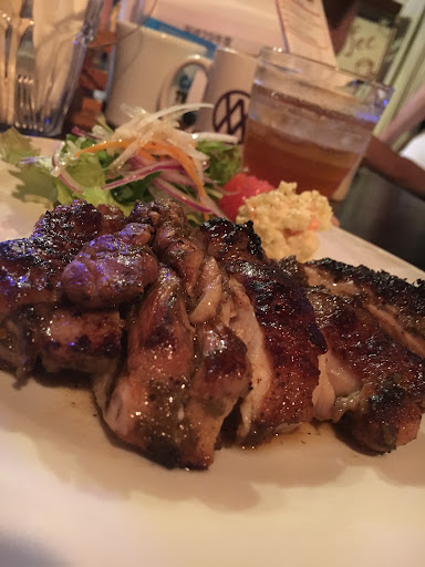 ローテーブル席にご案内頂き、フカフカなイスに身を沈めてまずはメニューを拝見。 外にもカウンターの上にも書いてあるんですが、やはりプレミアムハンバーグとステーキが一番人気。 更に豊富なメニューが揃っていて、スペイン産デュロック豚のカツカレーとかトルコライスとかロコモコとかめっちゃ惹かれるメニューに加え、めっちゃ美味そうなジャークチキンに照り焼き丼にタコライスなんかのガッツリ系が続き、そしてお酒に合うアヒージョなど様々なおつまみに、サラダ、チキンの香草焼きなどのメイン、ピザ、パスタ、カレー、チャパティーロールなど、ガッツリの食事も出来れば軽くつまんで飲むのも出来るメニュー構成。 更にパフェも種類充実しているし、カフェ系のドリンクメニュー、コーヒーだけじゃなくフルーツジュースやスムージー、クリームソーダなんかもあって、もちろんアルコール類も充実と、こんな店があったら良いなってのが具現化したかのようで、めっちゃ私の好み(^-^)