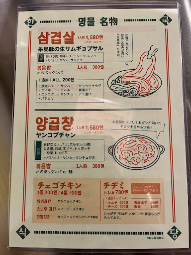 Read more値段設定が高すぎる。 周船寺でこの設定は高い気がする。 料理は残念。料理にボリュームと 美味しいがあれば別ですが。 サムギョプサルは肉質は悪くない 量は少なめ。チェゴチキンは店で 食べるレベルじゃない。美味しくない。 付け合わせは1品ずつ韓国料理とは 言い難い、味は似せてるが美味しいとまではいかない。コチジャンベースのタレと サムジャンも正直美味しくない。 チャミスル980円には正直驚く高すぎる。 店員もその場しのぎな接客で早く 終わらせて帰りたいのか どんどん片付けていくので 高いお金払ってまた来たいとはならない。 申し訳...