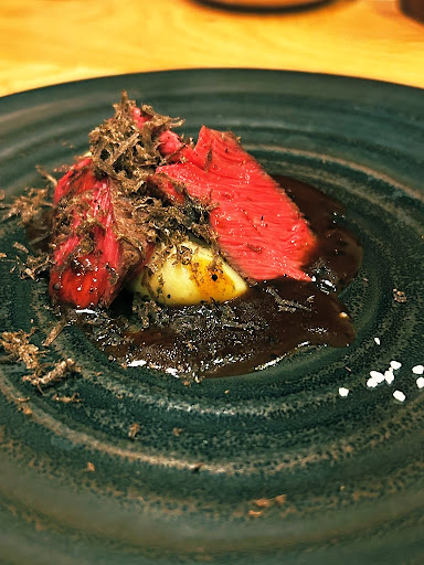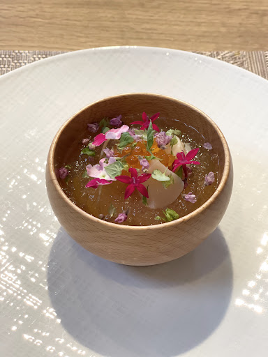 The meal started with a seafood appetizer featuring shrimp, salmon roe, and caviar over a delicate jelly, offering a burst of umami with every bite. The beet soup was visually striking, with a creamy texture and earthy depth, finished with delicate floral garnishes. Then came a truffle-infused egg dish, where the luxurious aroma of shaved truffle enhanced the creamy and savory egg base, making it an indulgent highlight.