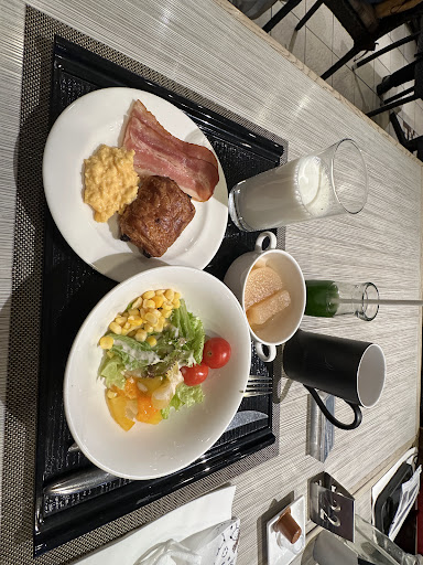 Low-key hotel buffet restaurant, open all day & offering breakfast fare, steak, veggies & desserts.