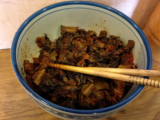 そのまま一気に最後まで食べ尽くしてしまいそうでしたが、卓上のトッピングに目が行き蓮華を止めます。 基本的にはとんこつラーメン用だと思われる、辛子高菜が置いてありました。 このやきめしのレベルであれば、辛子高菜もきっとかなりのレベルでしょう。