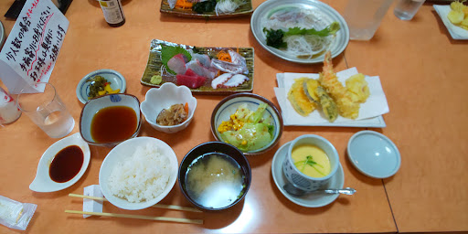 そして天ぷら到着。エビ2尾、いか、白身魚、かぼちゃ、なす、まめ。 揚げたてでサクサク、油の香りまでうまい。 「味自慢」と旗を掲げてるだけあって、これは納得。 880円でこのクオリティ、まさに“海のコスパ王”。 夜は居酒屋になるそうで、次はお酒と合わせて「いかの...