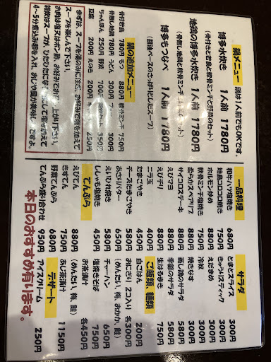 18時前に到着したが店内はほぼ満席。出てきた順番で。お通しは美味い。やりいか活き造りは当然ながら動いている。コリコリしてめちゃくちゃ美味い。刺身醤油はまあまあ。活き車えびは小さめだが美味い。あじ活き造りはプリプリしててめちゃくちゃ美味い。チャーハンは干し海老が入っている。パラパラが好みだが美味い。やりいかあと造りの天ぷらはめちゃくちゃ美味い。天ぷら盛り合わせ。大きな皿にのっているので少なく感じる。揚げたてだから美味い。博多水炊きは塩で食べる。若鶏1人前と地鶏1人前のミックス。有名店に負けてない。追加で雑炊セット。全体的に美味しか...