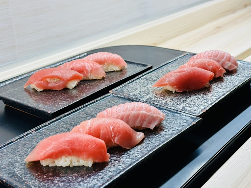 次に「マグロ三種盛り」がレーンからご開帳されると「ワーオ」と声が上がる〜綺麗な3種類の本マグロは大トロ、中トロ、赤身とどれも繊細な味わいで美味しかった!シャリは赤酢をブレンドしたほんのり甘味がある鮨酢で良いですね〜最高なネタを美味しくする名脇役に徹しています。