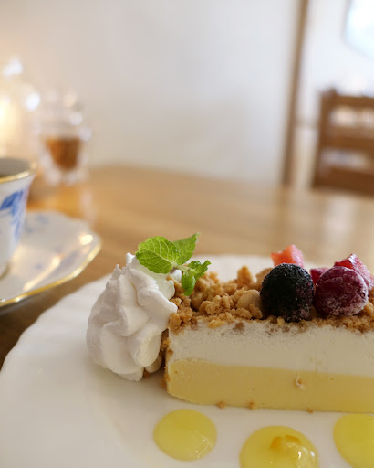 運ばれたコーヒーは苦味と深み、ほのかな酸味がおいしいです。 アイスケーキは予想したより華やかなプレート。 チーズケーキの上にたっぷりかかったサクサクのクランブルの食感も楽しくて、回りの2色のソースを付けながら食べると一口ごとに変化があって楽しいです。