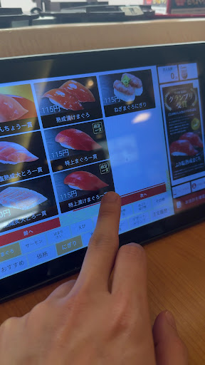 席に案内され、さあ食べよう!とタッチパネルを操作した瞬間、「混み合っているため注文できません」の無情な表示。 最初は「まあ混んでるし、少し待てば大丈夫だろう」と思っていました。 しかし5分経過、10分経過…20分経っても画面は変わらず。 その間、目の前には空いた皿も水もなく、ただただ沈黙のテーブルと虚しく光るタッチパネル。 隣の席では家族連れが「もう帰ろうか」と話し始め、反対側の席では学生グループが「何も頼めないのヤバすぎ」と笑い話にしていましたが、私からすれば笑えない。 回転寿司の本質は“食べたいものをスムーズに選んで食べられる”こと。それが最初から崩壊している時点で、もう試合終了です。