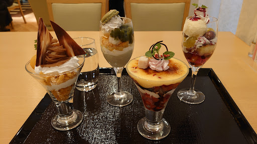 コース内容: ・抹茶パフェ ・北海道ソフトクリームとマンゴーのパフェ ・チョコと苺のブリュレパフェ ・マロンパフェ ・ぶどうパフェ ・北海道産小豆の栗おしるこ ※上記全種類のハーフサイズも選べます +350円でソフトドリンクのドリンクバーをお付けできます