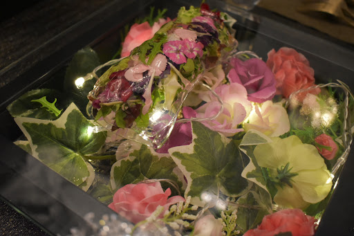 ●エディブルフラワーのサラダ お花造花の上に透明の板を挟んで本物のお花のサラダ。 どこまで食べれるお花か分からない…!😆 綺麗…! 透明のゼラチンでお花のサラダを自分で巻いていきます。 シャンデリアが映ってきれい✨ 「恵方巻きのようにどこかに向いて食べて下さい」 サクサクしたシーズニングドレッシングが中に混ざっていて和風の味付けで美味しい!!