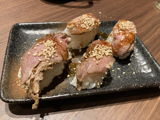 料理はどれも写真とは大違い。 熟成肉寿司は、写真のとおり火の通り過ぎた肉が乗っています。 にんにくを避けたかったのに、味付けも選べず、にんにくの効いたタレがかかったものが来ました。 タレの味が強すぎて肉の味を感じにくく、しゃりもすぐ崩れて食べにくかったです。