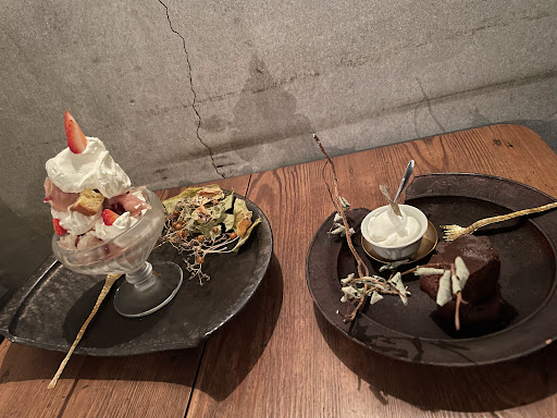 ガトーショコラの上にのっていた落ち葉?と木の実つき小枝?を器の端っこにどかして食べ進んだが、ガトーショコラもラムレーズンもポロポロしていて、枝から落ちた木の実と暗がりで区別がつかず口に運んでしまった、笑