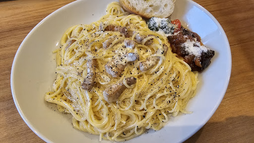 Carbonara is real carbonara made with egg yolk, not cream. It has salted pork, but it goes really well with the noodles and sauce, and the texture is...