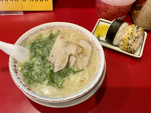福岡で5店舗展開している老舗のラーメン居酒屋チェーン店、長浜御殿。 創業が1971年で屋台からはじまり、その5年後に最初にお店を出したのが長尾店、こちらはもうなくなったんですが最初のお店ということで小さく駐車場もなかったこともあり、堤、荒江、住吉と店舗を展開した後に2015年に長尾本店として駐車場付きの大きめなお店としてオープンしたのが今回ご紹介する長浜御殿長尾本店となります。 ちなみに長尾店は2023年5月に閉店されています。 駐車場に車を停めてお店の前に。 中締め無しで営業されているのがありがたい。 店内は右手にL字型のカウンター8席があってその奥に厨房、左手に4人テーブル席が3つ並んでいて全部で20席あります。 冷水機でお冷を注いでテーブルに着席。 壁に貼ってあるメニューを拝見しますが、実は各店少しずつメニューが違うんですよね。 設備上の問題なんですが焼鳥があるお店と無い店、骨付カルビがあるお店と無いお店があります。 ちなみに長尾本店はどちらもあり、ラーメンとギョーザ、とん足に骨付カルビ、焼鳥とフルセットで楽しめるようになっております。 ※焼鳥の販売は17時から まずはおでん、これはカウンターの真ん中におでん自体が置いてあるので見ながら注文すると取ってくれます。 マイ定番は玉子、スジ、大根、こんにゃく。 鶏ガラと野菜のおでん出汁はスッキリしつつ味はしっかりしてて滋味深く美味しいんですよね。 更に追加でギョーザ、骨付きカルビと焼鳥を注文。 長浜御殿と言えばギョーザやろと言う方がいらっしゃるくらいギョーザも安いし美味いし人気です。 カリッと焼いた餃子はお店で製造されていて餡の味がしっかりしてて適度に野菜の食感とジューシーさがあってめちゃくちゃ美味いんですよね。 これが8個で280円はめっちゃ安いと思います。 次に骨付きカルビ。 牛骨付きカルビは細切りされていて、肉自体の歯応えはしっかり、味付けもしっかりしててめっちゃお酒に合うヤツ。 そして骨周りの肉がまた美味いんです(^-^) 焼鳥は種類こそ多くありませんがピーマン、ピリ辛つくね、砂ずり、豚バラ、サガリと一通り注文。 どれも美味しいんですが特にサガリ、カルビと同じく肉の旨味が濃くて美味いんですよね。 そして〆にラーメンを注文。 シンプルにチャーシューとネギが入ったシンプルな一杯。 豚骨とニンニクを丁寧に炊いたスープ、複数の寸胴で炊いたスープをブレンドして作る一杯はしっかり豚骨感がありつつクセがあまり無くて食べやすい味わい。 これがタイミングによってはめっちゃ濃い時があってそれが大当たりなわけですが、累計100回以上訪問して大当たりは5回くらい、普段は濃度はむしろ控えめですがそれもまた卓上のゴマ、コショー、紅ショウガ、ラータレで美味しくカスタマイズして楽しめる、これがまた長浜ラーメンの良さですよね。 そしてチャーシューはもも肉っぽく肉肉しくてしっとり系、ネギも効いててコショーも合う。 替玉したら丼に麺を入れてくれるのでゴマやラータレを投入して紅ショウガをのせてスープまで完食。 今時ラーメン1杯590円、他のサイドメニューもお値段控えめなのに美味しく、トータルでのコスパが最高だし、長年愛されているのもよくわかります。 コスパ良しで美味い老舗、機会があればぜひお試し下さい。 #長浜御殿 #長尾本店 #長浜ラーメン #豚骨ラーメン #餃子 #ラーメン居酒屋 #福岡グルメ #福岡ラーメン...