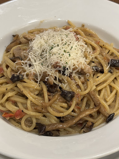 チーズとポルチーニの香り、ぶなしめじ、舞茸、国産豚のソテー。 こちらも香り豊かで、麺によく絡み、美味しいです。豚のカットが丁度いい大きさで臭みもなく、食感を楽しみながら、頂きました。