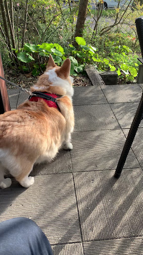 テラスなら犬も一緒に利用できます。 離席中のお客さんの書類が突風で飛んでいったのをスタッフさんがわざわざ回収してた、親切。