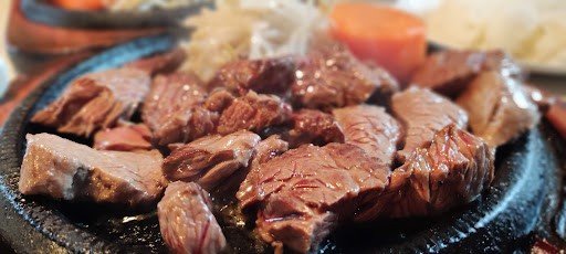 アツアツの鉄板の上に山盛りのカットされたステーキ、肉の横にもやしと甘い人参の付け合わせがのっています。