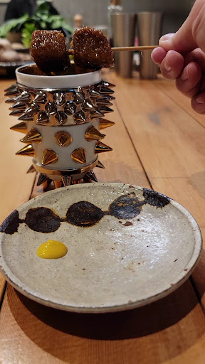 ・木下牛 串カツ トゲトゲのソース入れに、二度づけ禁止の串カツ。良いお肉の串カツ、初体験。丁寧な味わいになる。肉の美味しさに合わせたソースが程よい酸味が感じられ良い。
