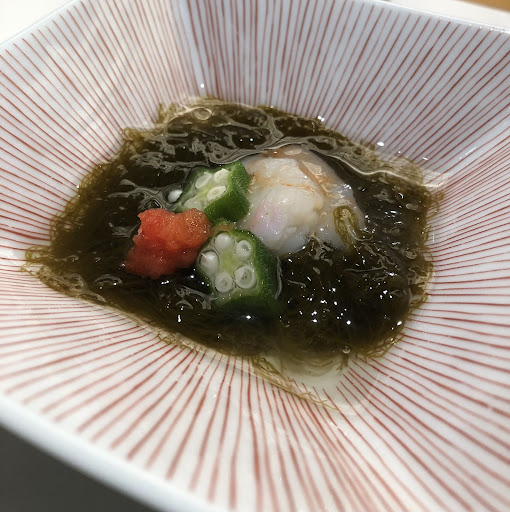 座席の白いカバーが大好きです、お寿司屋さんに来たーってなりますね^ ^ それとお酒、毎回違う器、錫と陶器の注ぎ口から流し込む冷酒の涼やかさが夏って感じにさせられます、コース牡丹の10種類程度の料理をタイミングよく並べて頂けるスタッフの方々に感謝ですね!至福の時でした。