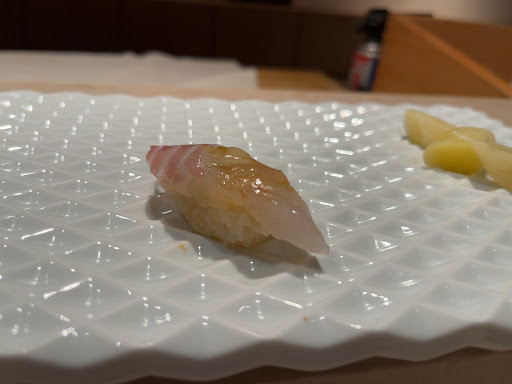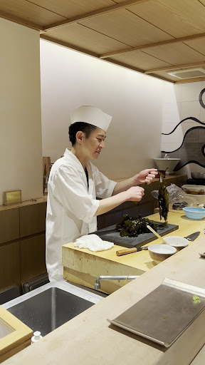 店鋪坐落係民居之中,門面一個鮨字正正說明這是一間壽司店,走入去就係一張長長的壽司吧枱,可以容納8人觀賞師傅即席烹調。今晚我哋預訂了廚師發板,一邊點了飲品一邊靜靜的等師傅安排食物。